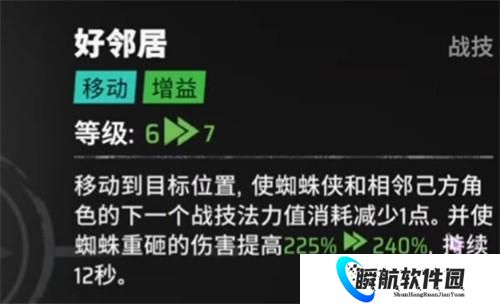 这是一个兼具位移与增益的多功能技能。使用后蜘蛛人可快速移动至指定位置,并为自身及周围队友提供下回合战技法力消耗降低的效果,同时提升“蜘蛛重砸”的伤害数值。该增益状态可持续12秒,且在技能再次释放时效果可刷新。这一技能增强了蜘蛛人的战场机动性和团队协作能力,在关键时刻可帮助队伍节省资源并提升控制衔接的稳定性。