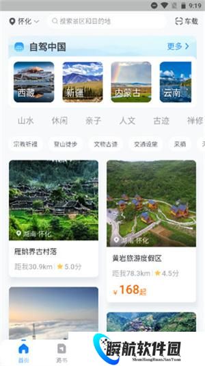 2、点击进入首页,你可以自行选择山水、人文、古村落、亲子游等,查看推荐去的地方;