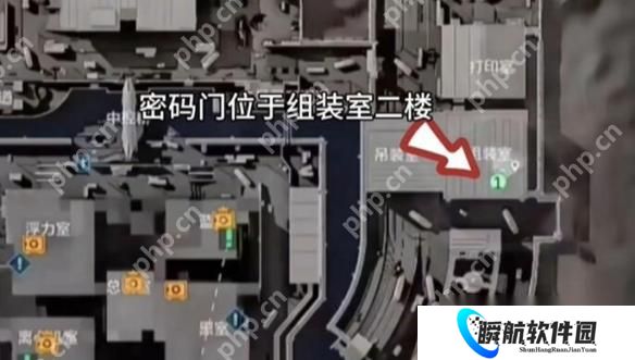 密码门在工业区右侧的组装车间二楼。登上楼梯后即可在机械设备后方找到门体。该区域敌人较多,务必小心推进。