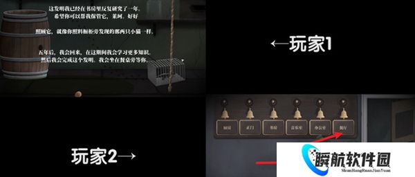 3、根据玩家1的线索,摇动玩家2右侧餐厅的铃铛把门打开,如下图: