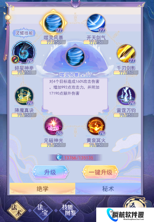 A:通过【法术】入口的【法术】功能可以消耗真气值升级技能。