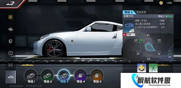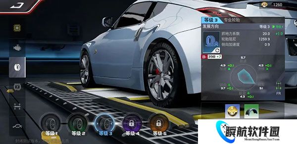 好的轮胎不仅可以提升赛车的抓地力系数,还能提升侧向加速度。370Z的等级1轮胎提升到等级5,可以将抓地力系数提高4.0,侧向加速度提升0.1,这既可以提升车辆的加速和刹车性能,还能减少车辆漂移时的侧滑。