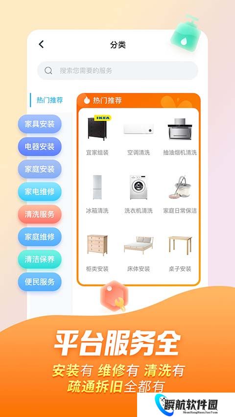 2、260+种家居服务类目,涵盖安装、维修、清洗、保洁、疏通、拆旧等全方位服务。