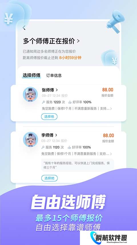 2、首创报价模式,能自主选择师傅,并在师傅报价后,确保不会受到任何随意加价。