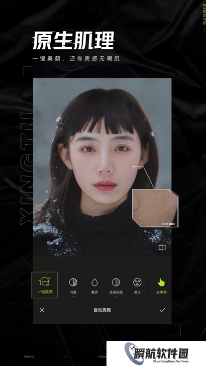 1、一键操作,拥有高级质感肤质。 自然细腻不假白,轻松修出好肤色。
