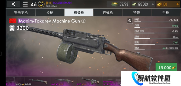 经过多个版本的洗礼,这把马克西姆托卡列夫机枪变成了黄金售卖,与其旁边的勃朗宁相比,性价比高出很多。110的默认伤害,45m最大射程,支援甲50%机枪伤害加成,可以让这把枪成为机枪中的佼佼者(MG34在射程瞄准方面是逊色于它的)