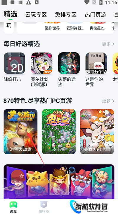 1、打开软件在游戏的页面中有云玩专区、专属云玩、精选等。