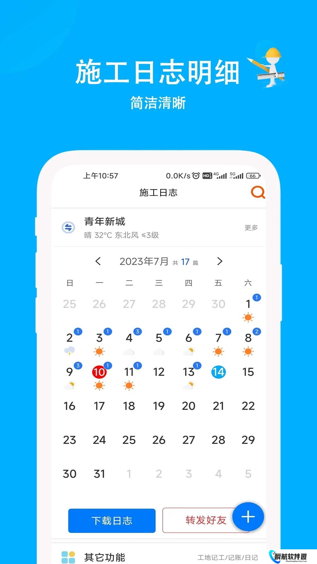 施工日志是专为施工企业、团队打造的一个日志记录软件,帮助施工团队实时记录今天任务的完成进度,添加图片、列表、标题对日志进行修饰,以便详细记录当天的工程日志。日志可以导出成为日志PDF文件,以方便施工团队进行复盘,对未来的施工工作安排进行调整,还支持将施工日志转发转存到云端,永不丢失的施工日志。