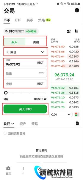 1、登录币赢,在底部导航栏点击“行情-现货”,搜索交易的币种 或 在底部导航栏点击“交易”进入现货交易页面,左侧币种栏搜索交易的币种,点击进入交易。