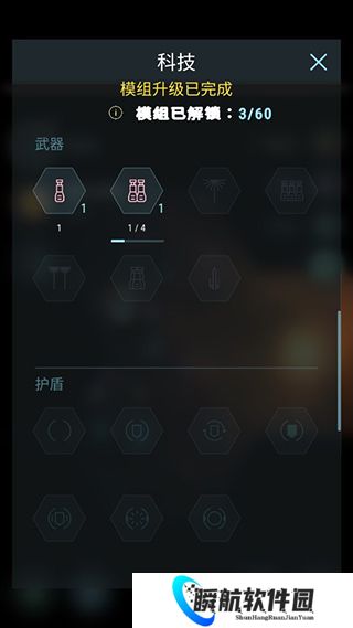 玩家点击左下角图标,即可进入科技页面,可以进行交易、采矿、武器、护盾等科技产品的生产,提升自己的战力;