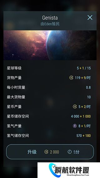 玩家点击一个已经战领的星球,再点击下方三个箭头图标,即可进行星球的升级。