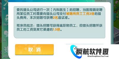 (3)猎头招聘的医生工资是普通招聘医生工资的1.5倍,所以想要做高月利润的话,猎头招聘是能不用就尽量不用,除非在升级医院时有一个科室就缺了一个符合条件的医生,这时候用猎头招聘可以应一下急,待医院升级后也推荐将其解雇的;