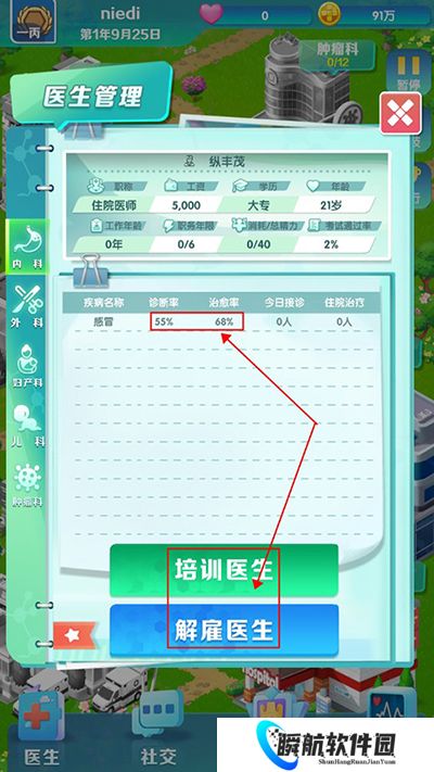 3、玩家在成功聘用医生后还可以查看医生的职业以及治愈率,如果治愈率过低,可以对其进行培训,提高水平,如果过低,可以将其直接开除。