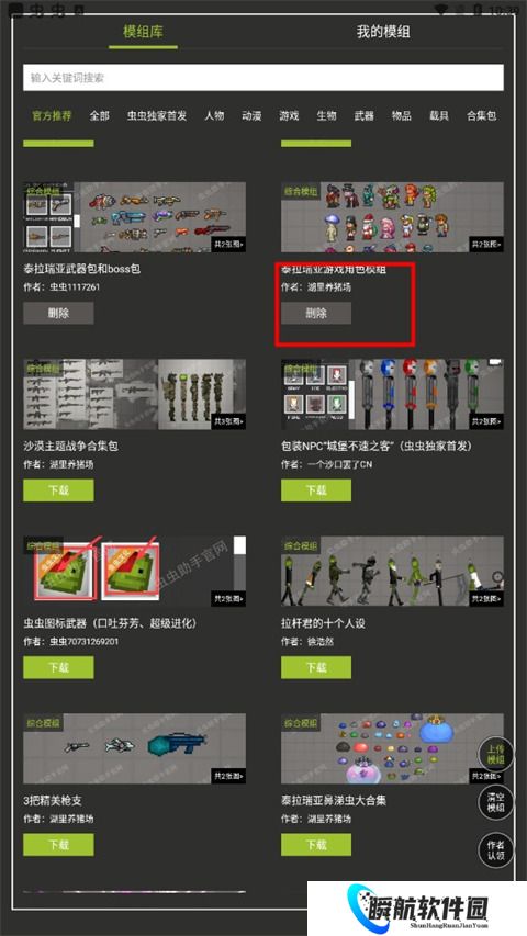 6、然后在模组库中玩家可以选择自己想玩的,这里有多种模组可以选择,如:人物、动漫、游戏、生物、武器、物品、载具、合集包、战争、超级英雄、建筑等等,玩家也可以自己上传模组和网友们共享;