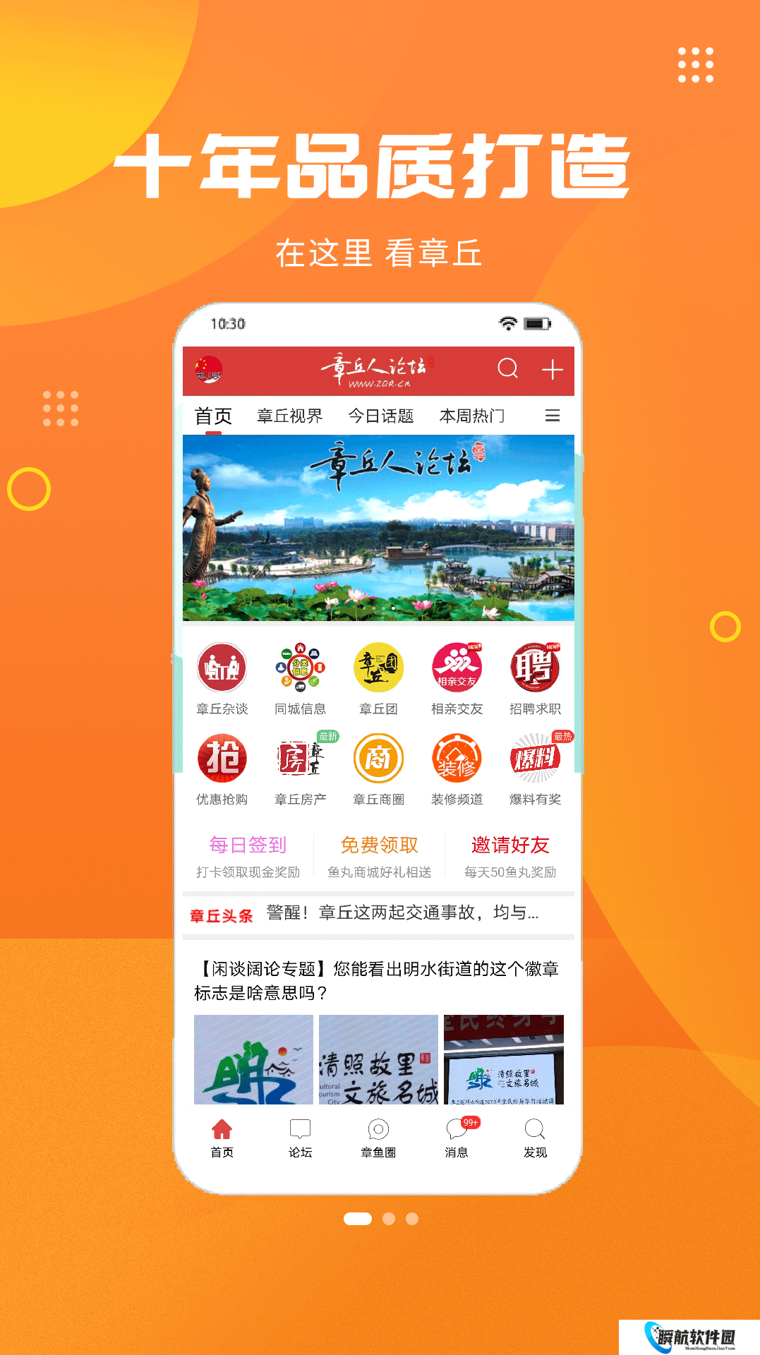 1、在本站下载安装章丘人论坛app,在手机上运行软件,可以发现有首页、论坛、章鱼圈、消息、发现五个板块。