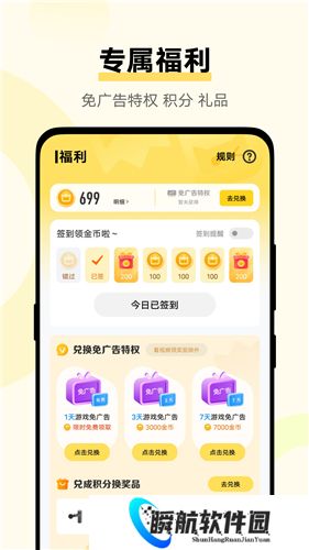5、点开【福利】,玩家可以签到领金币、然后可以用金币兑换免广告的特权,让你玩游戏更加轻松。