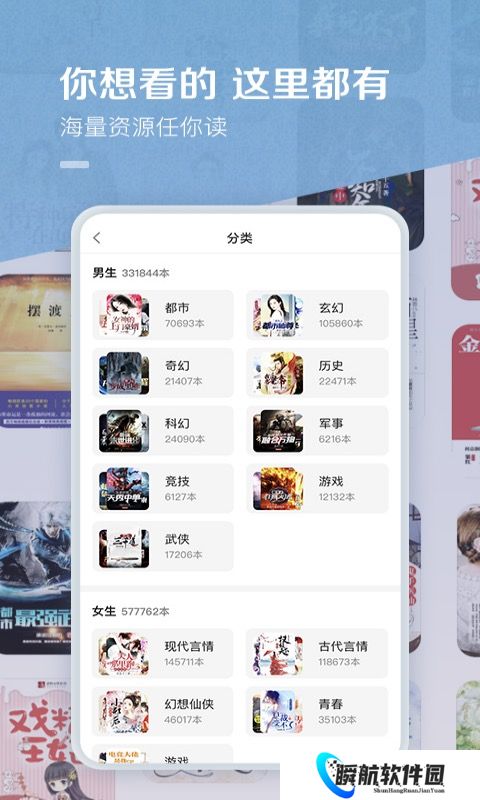 6、分类功能中提供了玄幻、奇侠、武侠、都市、历史等多种题材类别,还贴心的氛围男生、女生及出版分类,能很好地满足不同读者的需求。