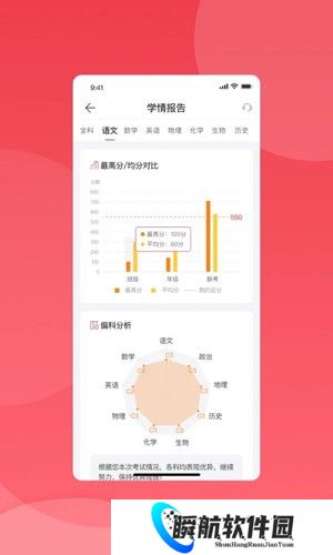 2、查看考试成绩,还会结合历史成绩分析偏科、错题数据,帮助学生明确学习方向。