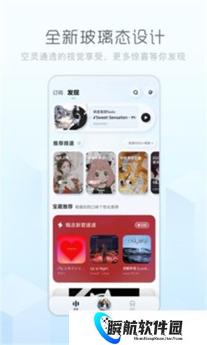 3、首页集成“发现”“推荐”模块,上下滑动切歌,并内置“音乐频道”实现边听边聊。