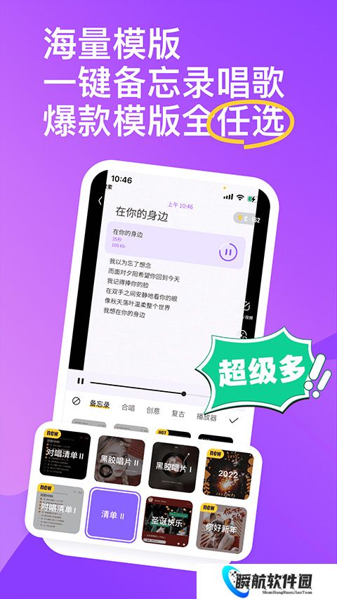 3、打造K歌音效、智能升降调、一键修音、超新潮音乐视频模版、特效、配图。