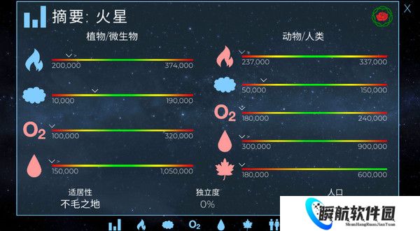 11、在星球详细摘要中,我们可以看到星球人口、宜居性、动物植物等等详细的数据,目前火星还是不毛之地,殖民尚未成功玩家仍需坚持!