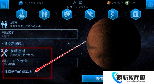 1、开局给你一颗火星,选择位置建造城市吧,从卫星云图中为我们的定居者找个家!