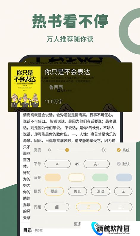 3、阅读过程舒适,支持多种阅读主题、夜间模式、翻页效果,随意切换阅读页横竖屏。