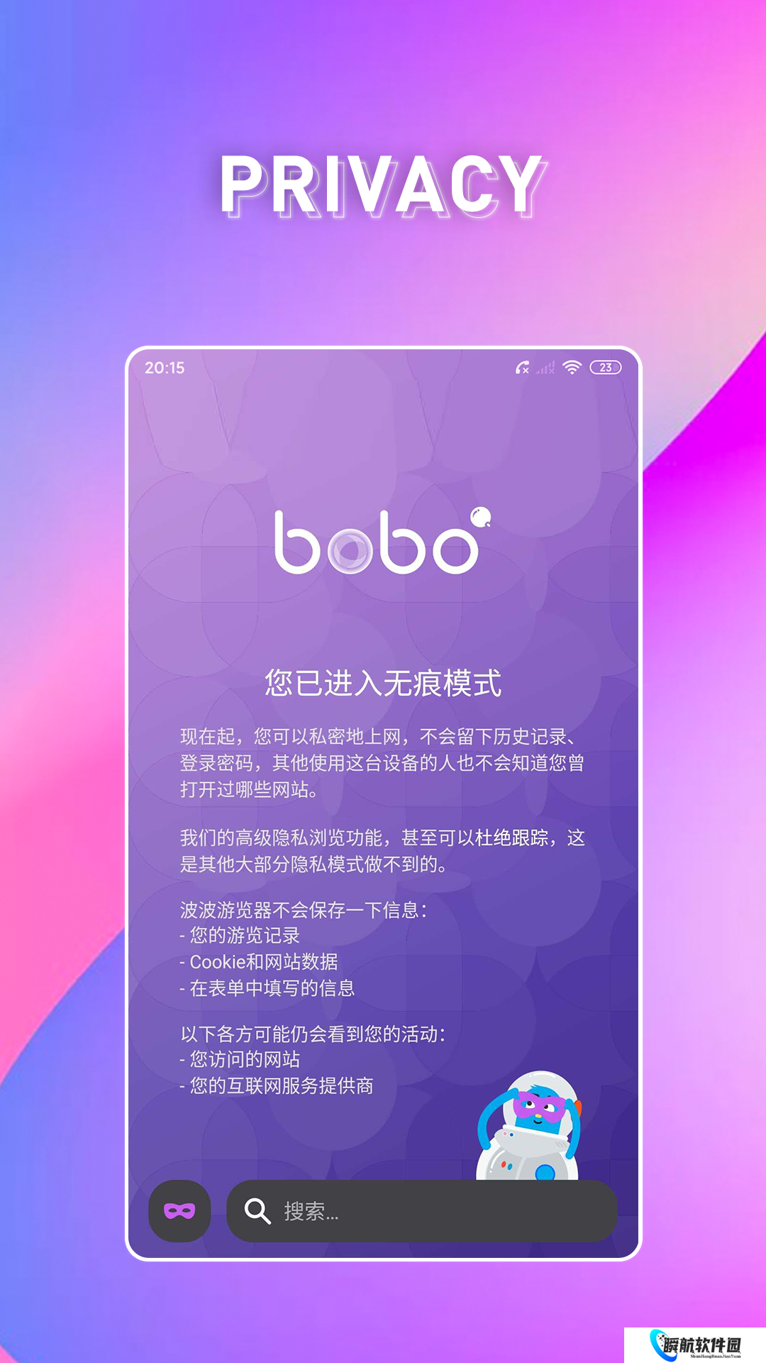 波波浏览器极速版是专为安卓手机打造的一款手机浏览器软件,也是原版波波浏览器的简化版本,在保留原本浏览器的上网与搜索功能时,删除冗杂的推广、视频界面,只留下一个干净的搜索与导航界面,带来更舒适的手机上网体验。支持百度、神马、360三大主流搜索引擎自由切换,输入搜索词一步即可到达搜索结果,相关网站一网打尽。