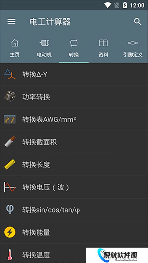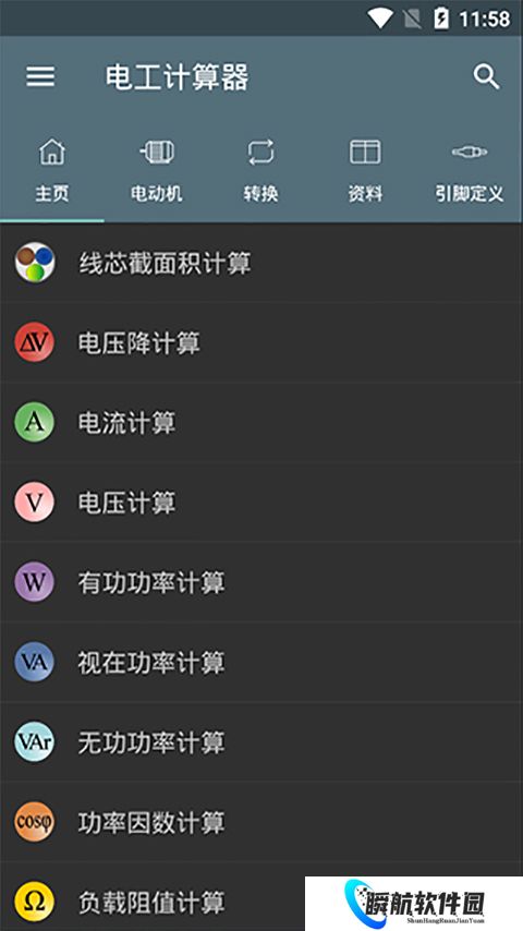 1、拥有最全面的电气计算功能,主要分为电动机、转换、引脚定义、公式、资料等类型。